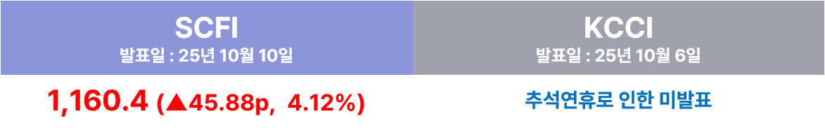 - 미중 관세 협상 불확실성으로 11월 14일 관세 재부과 시 중국산(145%)·미국산(125%) 모두 교역 급격히 위축 우려, 여기에 중국의 항만 요금 부과 가능성까지 겹치며 리스크가 확대되었다.